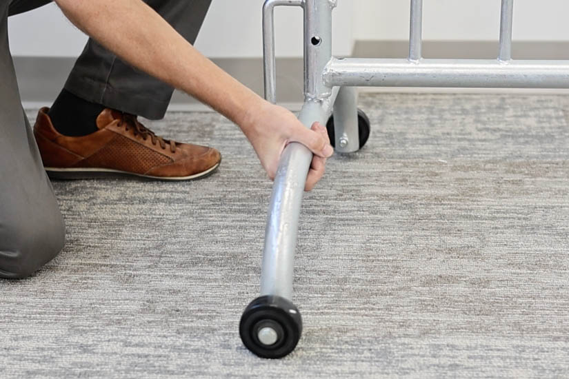 Built-in caster wheels support free-moving barricade panels while safeguarding floors. |