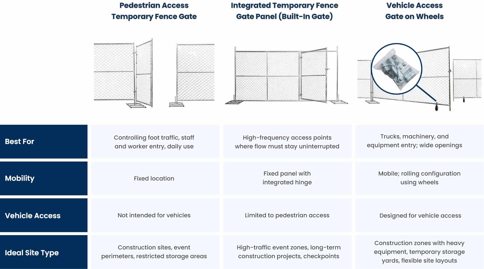 A: Pedestrian temporary fence gates or integrated gate panels work best when foot traffic is controlled. Integrated panels are better options for higher-frequency use, while standalone pedestrian gates suit fixed entry points.